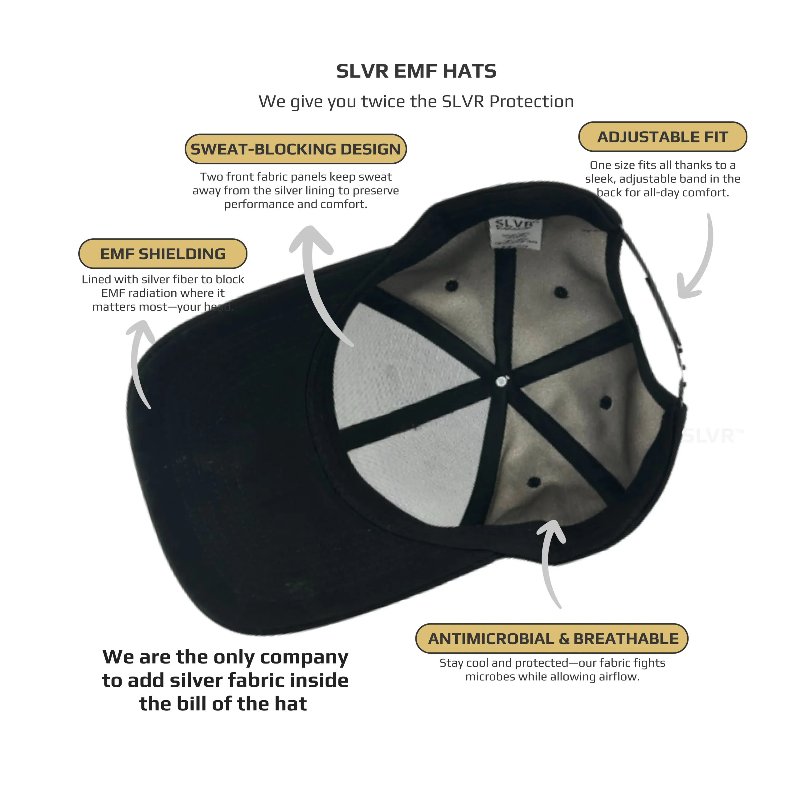 What’s unique about SLVR Wear ™ hats? All EMF hat companies put silver fabric in the dome of the hat. We believe we are the only company to integrate pure silver fibers directly into the bill of our caps. This exclusive innovation offers unparalleled protection and performance that you won’t find anywhere else.